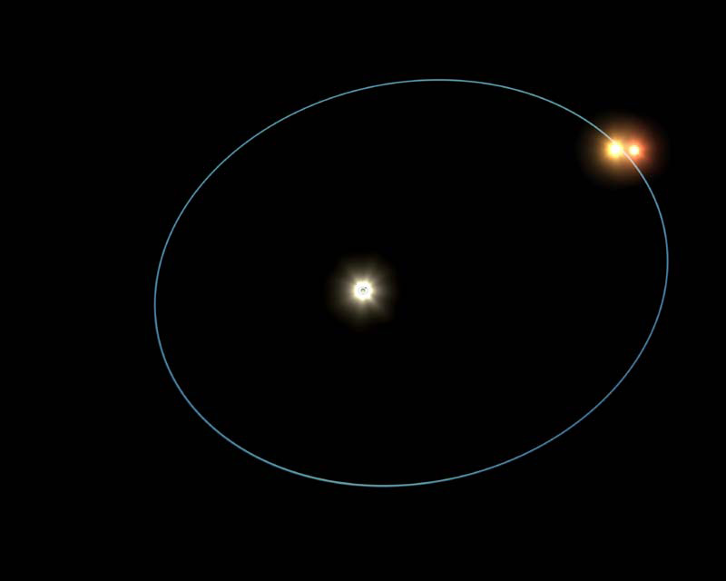 Именно такой системой является тройная Альфа Центавра, самая близкая к нам звезда после Солнца. Невооруженным глазом можно различить α Центавра А и α Центавра B, но только как единое целое – третью по яркости звезду на земном небосклоне. А вот с помощью телескопа с объективом диаметром хотя бы в 50 мм, уже заметны оба «компонента». Но рядом с ними на расстоянии в 2,2 градуса находится красный карлик Проксима Центавра, который вращается вокруг этой парочки.