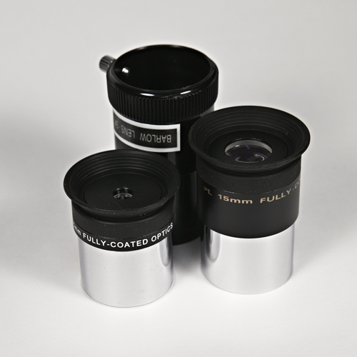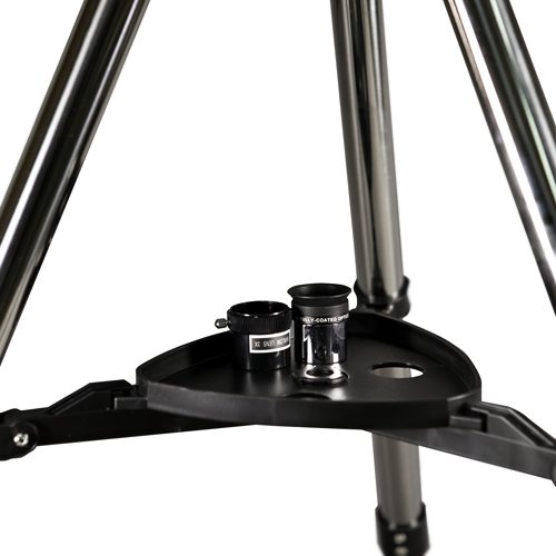 Кроме монтировки и треноги из стали, вместе с телескопом поставляются искатель в кольцах 8х30, двукратная линза Барлоу и два окуляра СуперКельнера с посадочным диаметром 6,5 и 15 мм (1,25").